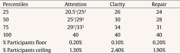 Regarding group differences, girls scored higher than boys in emotional attention, M = 28.89, SD = 5.53 vs. M = 14.79, SD =5.53; t(795.49) = 9.84, p < .01. No other significant gender differences were found. Age was not significantly related to any dimension of TMMS-24 (p > .05). There was no floor or ceiling effect in any scale (see Table 3). Table 3 shows percentiles 25, 50, 75, and 100 of the mean scores in boys and girls in each TMMS-24 scale.