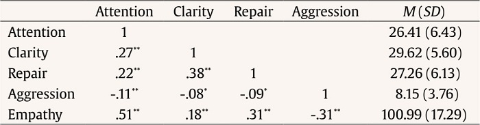 Pearson correlation analyses showed that three dimensions of the TMMS correlated with each other from .22 to .38 and effect sizes were between small and medium. Convergent and discriminant validity were tested through correlations between the TMMS-24 scales and empathy and between the TMMS-24 scales and aggression. As expected, Attention, Clarity, and Repair were negatively related to Aggression and positively related to Empathy with rs from -.08 to .51 and effect sizes between small and medium (see Table 4).
