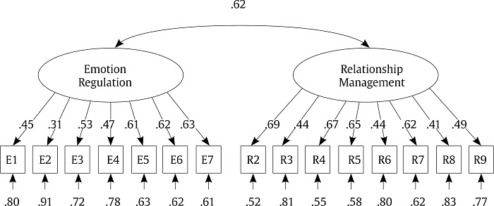 We conducted confirmatory factor analyses to confirm that the scenarios from the two subtests reflected two underlying latent constructs like in the original version (i.e., emotion regulation and relationship management skills). The two-factor model showed good fit to the data (χ² = 102.42, df = 89, CFI = .97, TLI = .96, RMSEA = .03, SRMR = .07). As illustrated in Figure 1, standardized factor loadings ranged between .31 ≤ λ ≤ .69 (M = .54). Even though the latent correlation between the subtests was large (r = .62), the two-factor model was superior to a one-factor solution (χ² = 142.79, df = 90, CFI = .86, TLI = .84, RMSEA = .06, SRMR = .07; Δχ² = 40.37, Δdf = 1, p < .001).