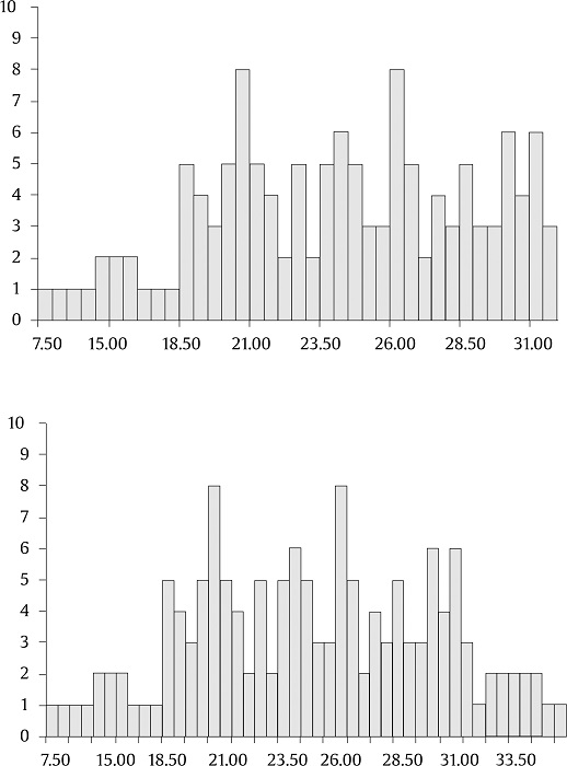 The satisfactory reliabilities for each subtest from the TRUST-PS and results from factor analyses supporting a two-factor solution allowed us to calculate total scores for each subtest. The total score for the emotion regulation subtest was on average M = 27.22 (theoretical maximum: 37 points) and M = 24.67 for the relationship management subtest (theoretical maximum: 41 points). Hence, our participants’ SEC was, on average, fair and somewhat higher regarding emotion regulation. The distribution of the total scores is illustrated in Figure 2. Female and male teachers did not differ regarding their average emotion regulation, t(141) = -1.49, p = .139, and relationship management scores, t(141) = -1.08, p = .280, and there was no correlation with teachers’ age (emotion regulation: r = .04, p = .653; relationship management: r = .07, p = .400).