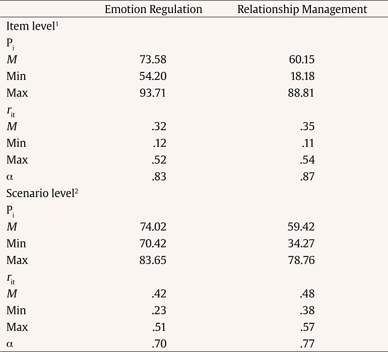 Calculating the internal consistency based on the 37 items and pairwise comparisons in the emotion regulation subtest (α = .83) and the 41 items and pairwise comparisons in the relationship management subtest (α = .87) yielded good reliability. A more conservative estimation at the scenario level still yielded satisfactory reliability (seven emotion regulation scenarios: α = .70; eight relationship management scenarios: α = .77). Table 1 provides an overview of the item-total correlations, item difficulties, and reliabilities for the final test version.