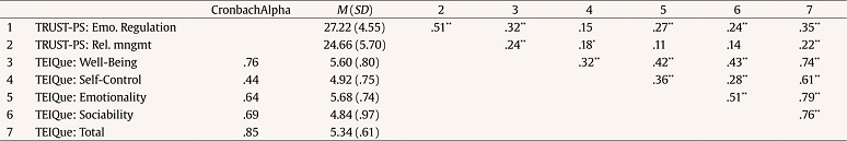 We examined whether the TRUST-PS was positively associated with teachers’ emotional intelligence, more specifically, the facets of well-being, self-control, emotionality, and sociability as assessed with the TEIQue-SF. The mean score of this questionnaire for our sample was 5.34 (SD = .61). According to the norms of its manual (Petrides, 2009), this score is located between the percentile 50 and 60. As Table 2 displays, both TRUST-PS subtests showed small to moderate positive correlations with the TEIQue-SF total score as well as with some of its sub-scales. Of the TEIQue-SF sub-scales, well-being had the largest and statistically significant correlation with both emotion regulation (r = .32, p < .001) and relationship management (r = .24, p = .004). In addition, the emotion regulation subtest correlated statistically significantly with emotionality (r = .27, p = .001) and sociability (r = .24, p = .004), whereas the relationship management subtest yielded an association with self-control (r = .18, p = .032).