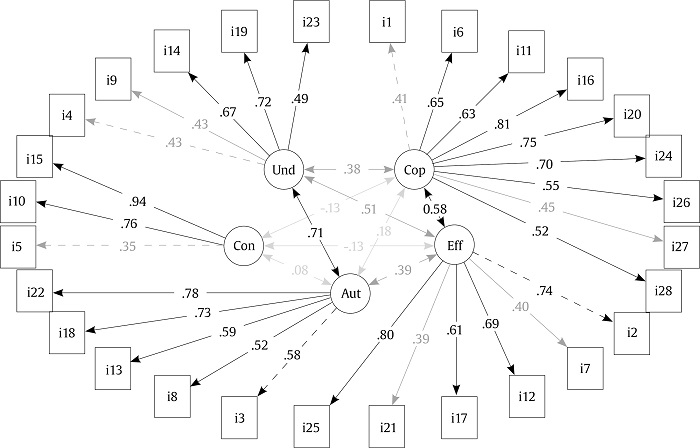 The tested measurement of the goodness-of-fit showed CFI = .932, TLI = .925, RMSEA = .065 [.063, .068] and SRMR = .067 for the five subscales of the model. The model fit values were adequate for the threshold proposed. The reliability of the scales in terms of internal consistency score between ω = .62 to .80, with an acceptable but lower score for the subscale Understanding/Career Interest (Table 4). Figure 1 shows the path diagram of the model with the standardized weights.