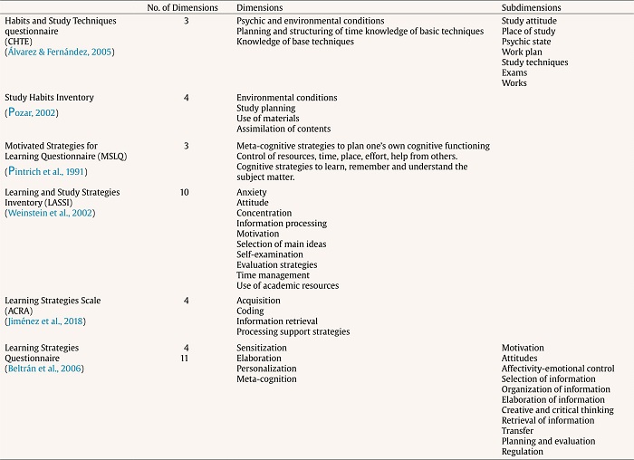 Research on study habits is closely linked to that of LS. The scales on study habits are usually more oriented towards secondary education students (12-18 years old). Learning strategies differ from LS and study habits as they imply the presence of an organization and planning system of learning methods and tools aimed at a good academic performance (Escanero-Marcén et al., 2018; Maya et al., 2021; Pashler et al., 2008; Shum, 2021; Song & Vermunt, 2021). Table 2 collects a summary of the main dimensions included in questionnaires and scales on learning habits and strategies, showing a variety of approaches and concepts.