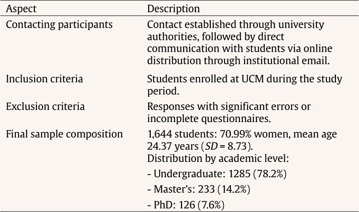 Using a cross-sectional design, the initial sample was composed of 1,841 students enrolled at the Complutense University of Madrid (UCM) in Spain; 11% of cases were excluded from the study due to major errors in responses or incomplete questionnaires. The final sample was 1,644 students with a mean age of 24.37 (SD = 8.73), 1,167 (70.9%) of whom were women, 1,285 (78.2%) were undergraduate, 233 (14.2%) were studying at master’s level, and 126 (7.6%) were PhD students from different disciplines (social science, science, humanities and engineering); 1,331 of the students were born in Spain and other European countries (85.1%) and the rest were from South America (9.2%), Asia (2.3%), North America (2.1%), and Africa (1.3%). The sample size was determined by the recommendation that a sufficient sample for analysis with WLSMV estimator must be made up of more than 200-500 participants (Kyriazos, 2018). (See Table 3 for the sampling procedure).