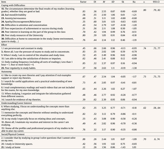 The omega internal consistency coefficients report an adequate reliability of the DinL factors, except for Understanding and Career Interest. The lower omega in this factor may be attributable to its measurement of the dimension with the largest content, which encompasses related items concerning studying by understanding and focused on the professional career. This factor necessitated a more extensive array of contents within the group of items comprising it.