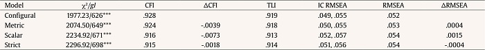 Regarding the analyses of items, the values show acceptable discrimination indices (Ebel, 1965). Besides, the responses are distributed between adequate values (0.70-1.11). Also, the asymmetry and kurtosis results (-1.5-1.5) meet the multivariate normality assumption (Forero et al., 2009). Despite some small shortfalls in strict invariance, the results in configural, metric, and scalar variance showed good results, indicating that the structure proposed is similar in both groups, the weights are also similar (i.e., the factors have the same contents in men and women), and the group mean differences in the items and factors are equal in both groups. However, the uniqueness parameters are not equal, which implies differences in measurement precision. The latter is not essential for comparison (Abad et al., 2011).