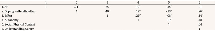 The five DinL subscales were correlated with perceived academic performance. Table 6 indicates that all the subscales were statistically significant at the .01 level. The perceived academic performance showed a positive relationship with Coping with Difficulties, Effort, Autonomy and Understanding/Career Interest, but a negative one with Social/Physical Context.
