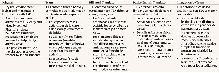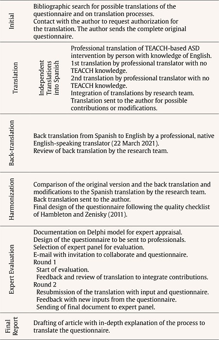 To avoid a literal translation, the first version in Spanish was elaborated by a research team of professionals with a proficient knowledge of English who intervene directly with students with ASD and were familiar with the TEACCH system. At the same time, the questionnaire was translated by two professional translators, one of them being a native English speaker. The main differences between the three translations were changes in the use of verb tenses, vocabulary specific to the field of education, as well as the specific vocabulary and descriptions used in the TEACCH instrument.