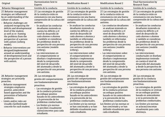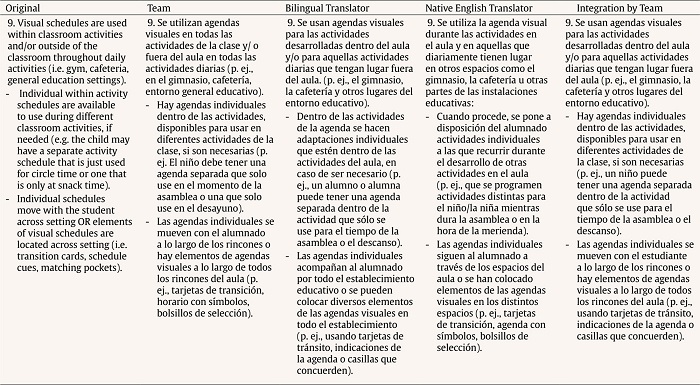 One of the most disputable aspects by the research team during the consensus process was the choice of appropriate structures or vocabulary to refer to very specific concepts of the TEACCH approach, that is, concepts describing components or original methodological strategies of structured teaching. For this purpose, it was very useful to check the literature on the TEACCH system that had been translated into Spanish (Mesibov & Howley, 2010/2003; https://teacch.com/). Finally, inclusive language was used to adequately address the gender view, which led the team to reach a consensus on the use of generic plurals in Spanish whenever possible.