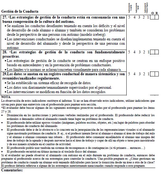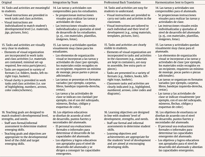 The analysis of the back translation showed that the overall meaning of each of the items had been captured. However, there were certain nuances, such as the use of clarifying adjectives and specific TEACCH concepts, which required rewording to increase item clarity and avoid any misinterpretations in item application. Finally, with the help of the checklist proposed by Hambleton and Zenisky as a reference (Muñiz et al., 2013), we obtained the final Spanish version, which was sent to the author for any contributions she considered should be made.