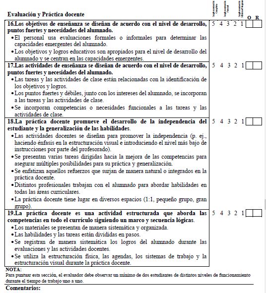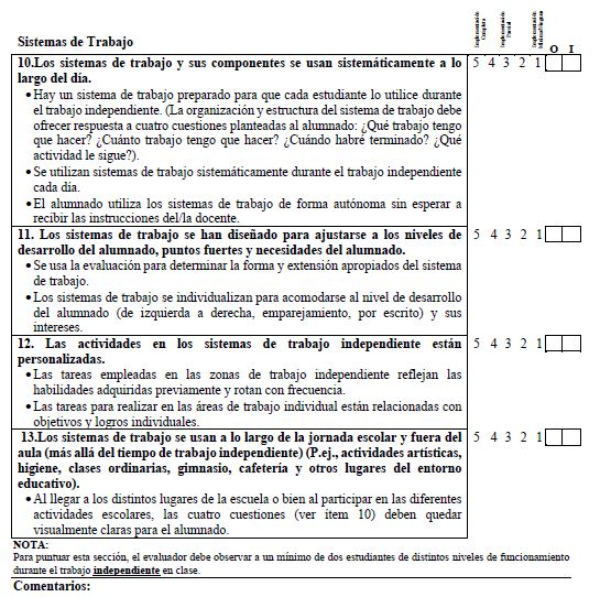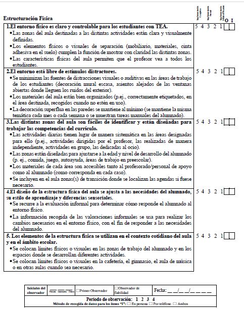 The aim of this work is to adapt the original version of the TEACCH Fidelity Measure into Spanish (Hume et al., 2011), an instrument designed to evaluate the implementation of each of the components of structured teaching.