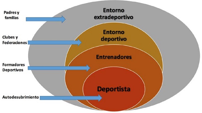 El entorno familiar (padres en adelante) en el deporte ofrece influencias socializadoras sobre la formación de características personales del niño/a (Carreres, Escartí, Cortell, Fuster, y Andreu, 2012), habiéndose relacionado con la percepción de habilidad (Boixadós, Cruz, Torregrosa, y Valiente, 2004; Horn, 1985, Smith, Smoll y Curtis, 1979), respuestas emocionales y afectivas (Brustad, 1988; Partridge y Wann, 2015; Omli y La Voi, 2009; Scanlan y Lewthwaite, 1986), la participación, motivación y grado de implicación en el deporte o en la retirada del mismo (Cruz, 2001; Fraser-Thomas, Côté, y Deakin, 2008; Gimeno, 2007; Ortíz, 2017; Smoll, Smith, y Cumming, 2007), en la transmisión de valores y en el desarrollo moral (Brunelle, Danish, y Forneris, 2007; Turnnidge, Côté, y Hancock, 2014) o la percepción del éxito deportivo (Carratalà, Gutiérrez, Guzmán, y Pablos, 2011; Keegan, Spray, Harwood y Lavallee, 2010; Torregrosa et al., 2007). Tales referencias psicológicas, facilitarán la preparación que reciban los jóvenes no sólo como deportistas, sino también como personas, estableciéndose y generalizando preferencias sobre la funcionalidad de la personalidad de los jóvenes (Luciano, Gómez-Becerra, y Valdivia, 2002), en cuanto a sus procesos madurativos (ver Figura 1).