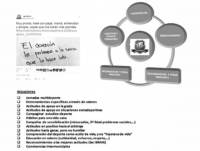 ABSTRACT: Recognizition of how the efforts made by parents in terms of time and dedication to the practice of sport by their children is absolutely relevant for organization of children’s sports. What the scientific literature has transmitted for decades does not seem so evident in the applied field, where integration of the figure of parents is very scarce, and even often understood as harmful. For eight years now, the BRAVE LEAGUE (Vega Baja of Segura River, Alicante) has pursued, through a competition in sports values, the development of sports behaviors in athletes, parents, and football clubs. For this purpose, we requested the collaboration and participation of parents and clubs (about 3000 people and 44 clubs), as behavioral models for children, by complying with behavioral norms. This will have an impact on a final classification of fair play scored in parallel to the sport activity. Based on the classification, young athletes will receive awards and recognitions at the end of the season. Throughout the year, parents are made different training proposals, which revolve around five specific objectives: a) to generate a positive feeling for the practice of sport; b) how to show family support to their children; c) the value of parents to favor sports performance; d) to understand the sports-school performance “double career”; and e) to develop positive behaviors to become references in sports and health. It is concluded that parents need to be trained and advised as any other figure in the field of children’s sports to improve management of their children, sportsmanship behaviors, and understanding of the work of other professionals in the field, such as the role of the coach and referees.