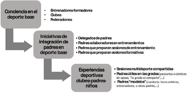 En la misma Liga BRAVE, se trabaja con las diferentes tipologías de padres (implicados, sobreimplicados, ausentes, “entrenadores en la banda”, etc.) en circunstancias de iniciación deportiva, y para cada encontrar las posibilidades de utilidad e intervención con cada una de ellas (Romero, Garrido y Zagalaz, 2009). El planteamiento de acciones donde se cuenta con la integración de los padres (Figura 3), comienza por mostrar al mundo del deporte base (profesionales del entrenamiento y la formación y clubes deportivos de base) los esfuerzos cada vez más necesarios para una formación a padres (comprender sus roles y oportunidades de aprovechamiento, limitaciones, transferencias positivas y negativas del mundo adulto al mundo infantil…).