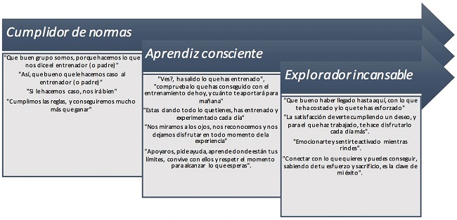 Es por ello, que a modo de recomendaciones, se trabajan con los padres estrategias y competencias que puedan ayudar a construir en sus hijos deportistas lo que se denominan Mentalidades del joven BRAVE (conjuntos de recursos psicológicos funcionales, basados en sus niveles de maduración a través de las experiencias deportivas, y alejadas de los tan poco útiles resultados deportivos) (Figuras 5). Las Mentalidades del joven que hace deporte, se establecen y consensúan en un continuo madurativo (el cumplidor de normas, el seguidor de huellas y el explorador incansable), basado en aspectos generales de los niños como la edad, la relación con los padres, y la maduración psicosocial (niveles comprensivos, de relación o creencias de autoeficacia, posibilidad y autonomía) (Cecchini, Fernández-Rio y Méndez-Giménez, 2015).