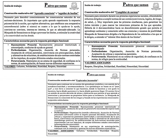 Para cada tipología, se diseñan fichas de trabajo en la que se trabaja con los padres en varias sesiones (Figura 6). Tras describir la utilidad que cada tipología de padre aporta a la mentalidad, se les instruye en como estructurar aspectos cotidianos, que facilitan la construcción de actitudes y recursos para manejar funcionalmente las experiencias con sus hijos dentro y fuera del deporte. Los padres participan en el diseño de tales sesiones, proponiendo temáticas e iniciativas a poner en marcha para las siguientes sesiones, según lo aprendido en cada una de ellas. De esta esta manera, se sienten partícipes e implicados en las acciones formativas, así como surgen nuevas acciones a implantar en jornadas posteriores, durante los partidos de sus niños o en cualquier momento de interacción con ellos y sus entrenadores.