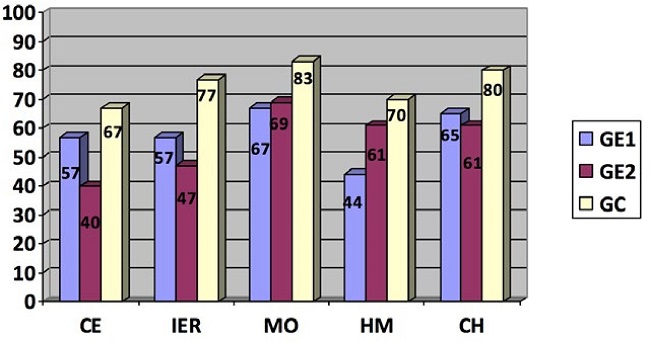 Cabe destacar que las puntuaciones del GC se mantienen igual o bajan (CE, IER, MO y HM), y solamente aumenta en CH. Sin embargo, en el GE1 todas las puntuaciones centiles aumentan, y en el GE2 solo aumentan CE y IER.