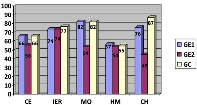 Cabe destacar que las puntuaciones del GC están en las 5 escalas por encima del centil 60, incluso alguna (MO y CH) en 80 o más. Sin embargo, las puntuaciones obtenidas por las jugadoras del GE1 como del GE2 se encuentran en un nivel medio, o medio bajo.