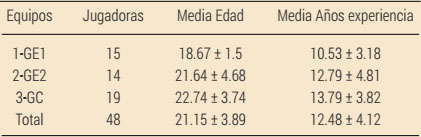 Los participantes fueron 48 jugadoras de fútbol, de las cuales 11 pertenecientes a 3 equipos de la categoría deportiva de Segunda División Nacional. Por razones de proximidad geográfica y viabilidad del estudio, 2 equipos (equipo 1 y equipo 2) fueron asignados al Grupo Experimental (GE1 y GE2) y el equipo 3 lo fue al Grupo Control (GC).