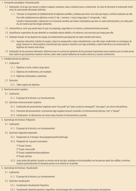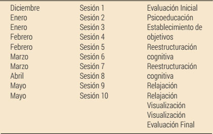 El programa de intervención psicológica fue el mismo para los dos grupos experimentales, adecuándose en cada caso a las fechas de disponibilidad para las sesiones, si bien en ambos casos el cronograma propuesto se cumplió. Se realizaron 10 sesiones grupales (solo las jugadoras y la psicóloga) de 1 hora de duración aproximadamente, cada 15 días, antes de comenzar el entrenamiento deportivo y en los vestuarios de cada uno de los equipos. En la Tabla 2 se puede observar el cronograma y contenidos del programa.