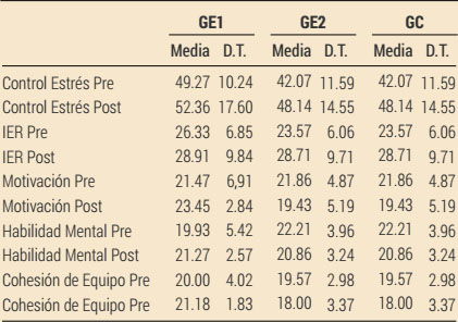 En la Tabla 4 se pueden observar las puntuaciones medias de las jugadoras en cada uno de los factores del CPRD, tanto antes del programa de entrenamiento psicológico como después del mismo.