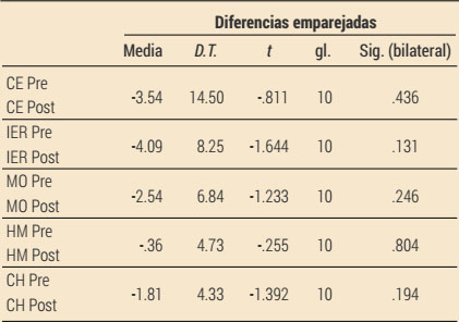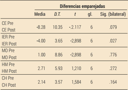 Tal y como se puede apreciar en el factor IER aparecen diferencias estadísticamente significativas entre las puntuaciones pre y post (p < .05). Además, se puede considerar la tendencia a la significación estadística en el factor CE (p < .10).