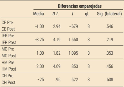 En la Tabla 6 se muestran los datos de la prueba de muestras emparejadas del GE2 y su significación estadística en cada una de las parejas de los factores del CPRD.