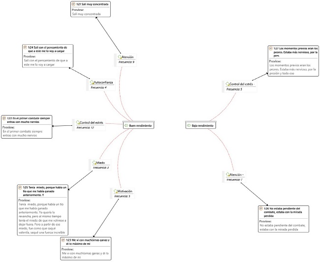 Al analizar las situaciones de bajo rendimiento, la atención aparece como variable más relevante, con 12 frases como “no me dio tiempo a concentrarme tan bien como en el primero”, “He perdido porque no tenía claras las cosas y la he cagado”, o “En el momento que estaba peleando me fui, me desconecté del combate. Sabía que estaba en el tapiz, pero mi mente estaba en otro lugar, pero no pensaba en nada. Al mismo tiempo, estaba aquí y estaba allá.”