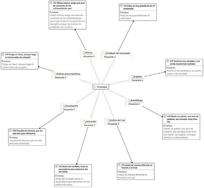 Por último, en la red semántica se ha definido como estrategia el nivel de activación aludiendo a expresiones como “antes del combate, tenso la musculatura para activarme. Así se me siento más activo” y “le digo a mi entrenador que me pegue para relajarme y activarme, y ya me centro en el combate”.