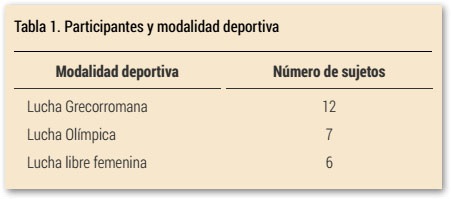 La muestra estuvo compuesta por 25 deportistas de lucha olímpica (ver Tabla 1), de los cuales 19 fueron hombres y 6 mujeres, con una edad comprendida entre los 16 y los 20 años, y con una media de 17.96 años. Los deportistas cuentan con una experiencia en competición de al menos cinco años. En relación al nivel competitivo, cabe destacar que todos compiten a nivel nacional e internacional y que 22 de los 25 sujetos han ganado el campeonato de España en alguna de las categorías en las que compitieron a lo largo de su trayectoria deportiva. En cuanto a los días y horas de entrenamiento, los sujetos de la muestra entrenan una media de 5 días por semana, 4 horas cada día.