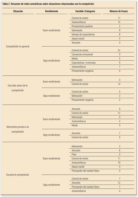 Si se analizan las redes semánticas del presente trabajo, se observa como el control de estrés y la autoconfianza aparecen con numerosas expresiones en todas las situaciones evaluadas. Estas dos variables son de las más estudiadas en cuanto a aspectos psicológicos que influyen en el rendimiento deportivo (Madigan, Hill, Anstiss, Mallinson-Howard y Kumar S, 2018; Márquez, 2006; McGrane, Belton, Powell y Issartel, 2017; Robazza et al. 2018).