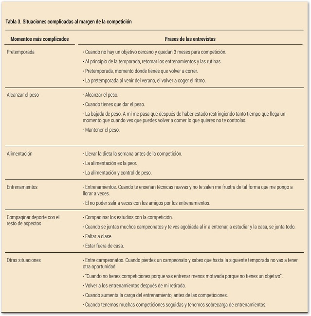 En cuanto a los momentos más complicados, cabe destacar la referencia a la fase de pretemporada, el ya comentado interés por mantener o alcanzar un determinado peso, a alimentación en relación a dicho peso, la dureza de los entrenamientos y la dificultad para compaginar deporte con estudios y vida cotidiana.
