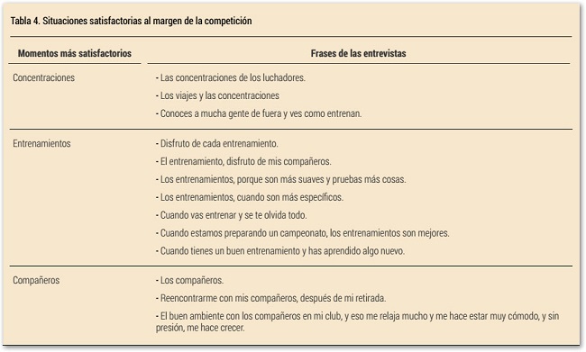En relación a los momentos más satisfactorios de la temporada al margen de los momentos periodos específicos de competición, los deportistas destacan las experiencias vividas en concentraciones, determinados periodos de entrenamientos y la relación con los compañeros (Ver tabla 4).