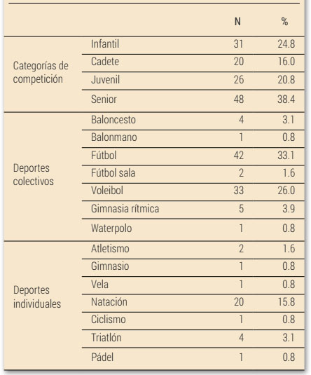 Participaron en este estudio un total de 127 entrenadores, de los que el 73.2% son hombres y el 26.8% son mujeres. Sus edades están comprendidas entre los 17 y los 64 años (M = 33.89; DT = 10.32). Los participantes entrenan diferentes modalidades deportivas, tanto de tipo colectivo (69.3%) como individual (23.7%) y categorías deportivas (ver Tabla 1). En cuanto a la experiencia como entrenadores, el 62.7% lleva entrenando más de 5 años, el 20.6% entre 3 y 5 años, el 8.7% entre 1 y 2 años, el 6.3% entre 6 meses y 1 año y el 1.6% entre 1 y 6 meses.