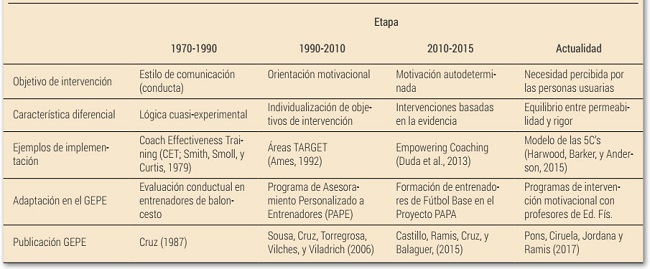 El GEPE (http://twitter.com/gepeuab) es un grupo de investigación aplicada sensible a la evolución de nuestra disciplina. Si se evalúa la Psicología del Deporte de manera histórica (e.g., Vealey, 2006) se comprueba que esta ha evolucionado desde una concepción exclusivamente positivista o post-positivista (i.e., existe una realidad única que es solamente aprehensible mediante el método científico, basado en experimentos, grupos control y replicabilidad) a una realidad en la que el post-positivismo convive con otras perspectivas más fenomenológicas o socioconstruccionistas (i.e., cada colectivo percibe y construye su propia realidad describible a la par que modificable a partir de una ciencia más basada en la transferencia y el rigor que en la replicabilidad). Esta evolución de perspectivas ha ido afectando la definición de los programas de intervención (ver Tabla 1) inicialmente concebida en términos cuasi experimentales en los que la intervención conductual se concebía casi como análoga a un tratamiento farmacológico con la que el receptor de la misma cambiaría su conducta y, por lo tanto, los efectos serían directamente observables. Esta perspectiva inicial ha ido dando paso, a principio de los 2000, a una concepción mucho más permeable a las necesidades percibidas por el entorno y las intervenciones han dejado de centrarse exclusivamente en la modificación de conducta y tratan de reconocer también las características personales de cada usuario, incluyéndose aspectos motivacionales en los contenidos de las formaciones (e.g., Smith, Smoll, y Cumming, 2007) para, progresivamente, ir individualizando tanto las conductas objetivo de la intervención (e.g., Sousa, Cruz, Torregrosa, Vilches, y Viladrich, 2006; Sousa, Smith, y Cruz, 2008) como, en la última década, los propios objetivos de la intervención (e.g., Harwood, Barker, y Anderson, 2015).