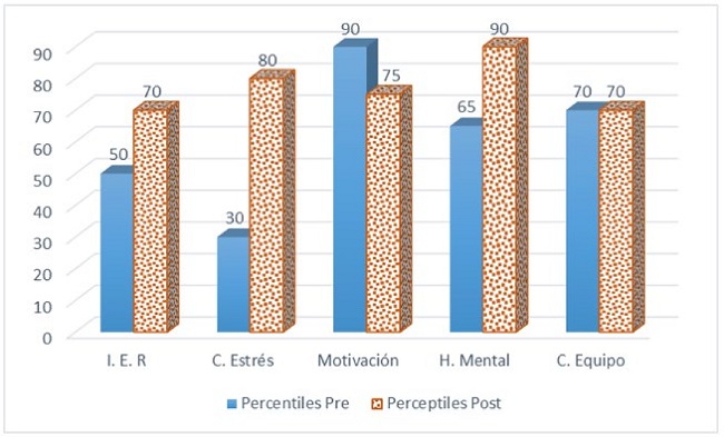 Los resultados cuantitativos del CPRD (Figura 1) muestran una mejora significativa de los factores Influencia en la Evaluación del Rendimiento, Control del Estrés y Habilidad Mental, donde se pasó del percentil 50 a 70, de 30 a 80, y de 65 a 90, respectivamente; una disminución en la Motivación (que estaba muy alta, pasando de 90 a 75) y un mantenimiento en un alto percentil de Cohesión de Equipo (en ambos casos percentil 70).