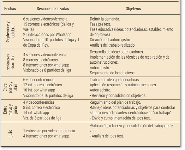 Aunque el psicólogo del deporte tenía conocimiento del fútbol (y eso ayudó a comentar situaciones deportivas y manejo de conceptos), el trabajo se centró en aspectos psicológicos relacionados con la demanda del jugador, y que era el que proporcionaba, si se requería, los criterios técnicos/tácticos y otros más específicos del fútbol, aun entendiendo que no existen “partes por separado”, sino que todo está interrelacionado, por lo que se analizaba conjuntamente respetando el criterio deportivo del futbolista y manejando las variables psicológicas en base a eso.