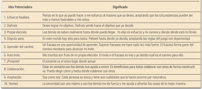 El planteamiento de creencias potenciadoras (Ellis, 1980; Peris-Delcampo, 2019), se realizaba en relación con el establecimiento de objetivos, de manera que, el tener claro qué podía hacer en cada momento y cómo evaluarlos, le daba seguridad y le hacía centrarse en su “trabajo” (estar pendiente de lo que le ayudaba a rendir bien). En principio, mediante preguntas de reflexión, se le cuestionó qué es lo que le hacía funcionar mejor. Tras dos sesiones (en la primera fase de la temporada), después de que el futbolista llegara a la conclusión de que podía centrarse en lo que realmente dependía de él, se le plantearon las diez ideas potenciadoras (Tabla 2), utilizándolas cuando se consideró necesario, para reenfocar el plan de acción. Además, para la mejora los conceptos de juego que él había decidido relacionados con los objetivos (por ejemplo, “presión tras pérdida al poseedor del balón”), se le instó a que se planteara mensajes a utilizar durante el partido que fueran potenciadores, convirtiéndolo en autoinstrucciones (Weinberg y Gould, 1995) para momentos clave del partido.