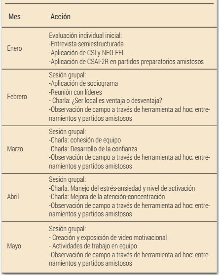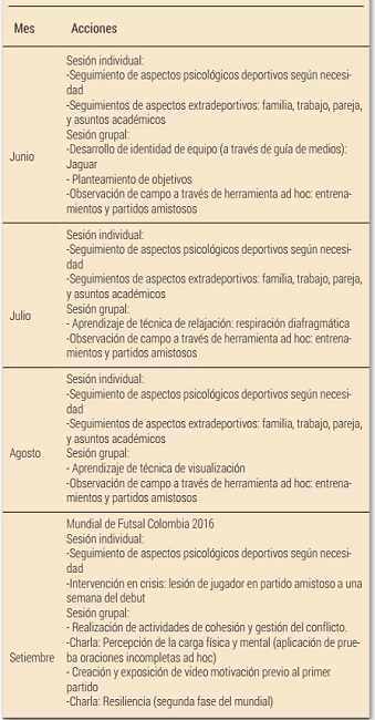 En enero de 2016, se inicia un programa de intervención psicológica compuesta de dos etapas. La primera, el trabajo mental orientado hacia la eliminatoria del Mundial de Colombia 2016, siendo Costa Rica sede, y la segunda etapa, la preparación psicológica para el propio mundial. El programa de intervención psicológica, según las etapas, queda reflejada en las Tablas 1 y 2.