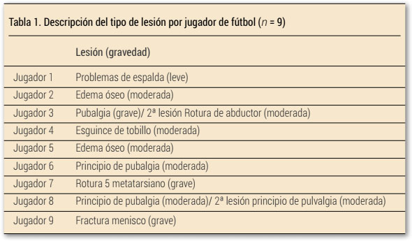 En la Tabla 1 puede observarse los jugadores y tipo de lesión experimentada por cada jugador (n = 9). Nueve de los veintidós jugadores (40.9%) habían experimentado una lesión en el momento temporal establecido (seis meses). Atendiendo a su gravedad (Buceta, 1996; Pascual y Marcos, 1998), un jugador tuvo una lesión leve, 7 jugadores tuvieron lesiones moderadas y tres jugador tuvieron lesiones graves. Según el tipo de lesión, se observaron lesiones de tipo muscular (problemas de espalda y rotura de fibras de aductor), lesiones tendinosas (pubalgia), lesiones articulares (esguince de tobillo y rotura de menisco) y lesiones óseas (edema óseo y fractura quinto metatarsiano). Dos de los nueve jugadores lesionados tuvieron dos lesiones en el periodo de los seis meses de evaluación.