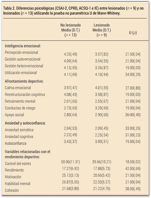 ABSTRACT: The association between certain psychological characteristics of athletes and incidence of injuries in a third division soccer team is analyzed (n = 22). In particular, the potential influence of anxiety (CSAI-2), variables related to sports performance (CPRD), coping strategies (ACSQ-1), and emotional regulation (EI) was assessed. Injuries sustained during the 6 months following the evaluation were recorded. Players with no injuries had significantly higher scores in emotional intelligence, cognitive restructuring, self-confidence, and variables related to sports performance, and lower scores in mental withdrawal and risk behaviors. It is concluded that some psychological variables are related to absence of sports injuries. Evaluation of such variables and development of psychological intervention programs for their prevention are therefore recommended.