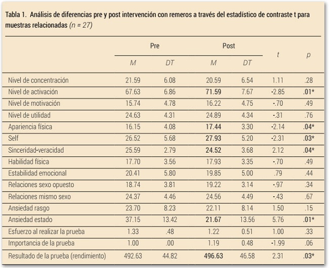 Las medidas psicológicas que mejoran tras el programa de intervención son la activación, la imagen y las creencias de capacidad que los remeros tienen sobre sí mismos, ligado a un descenso importante de la ansiedad estado. Todo ello entendemos que, está unido a unas expectativas positivas sobre la capacidad en la ejecución de la prueba y en su conjunto, a la confianza que tienen en sí mismos para mejorar el rendimiento en la prueba (Martens, 1987; Sánchez-Hernández y López-Fernández, 2005; Vargas, 2015).