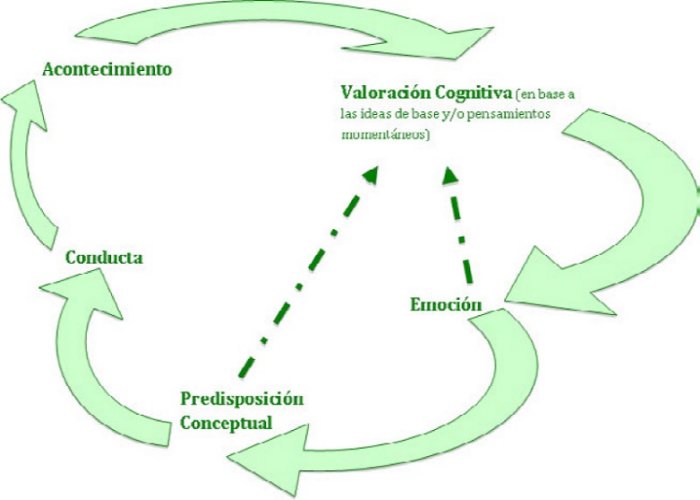 Desde los años ‘50 hasta la actualidad, se ha desarrollado esta disciplina que se basa en el procesamiento de la información, con el supuesto de que son los pensamientos, ideas, imágenes... las que actúan de filtro cognitivo que determina nuestras emociones y nuestras actuaciones (Eysenk, 1990). A modo de ejemplo gráfico, un esquema generalmente utilizado para entender esta cuestión es el de Wright (1988), en el que se observa que cuando ocurre un acontecimiento (situación), se produce una valoración cognitiva (ese “filtro” en forma de pensamientos automáticos, imágenes, ideas preconcebidas...) y en función de eso aparece la emoción y la predisposición conceptual en base a todo lo anterior y de los esquemas mentales previos del individuo, para después producirse la conducta, que a su vez influye en el siguiente acontecimiento y así se repite el ciclo, donde cada una de las partes influye en la otra según se observa en el esquema de la Figura 1.
