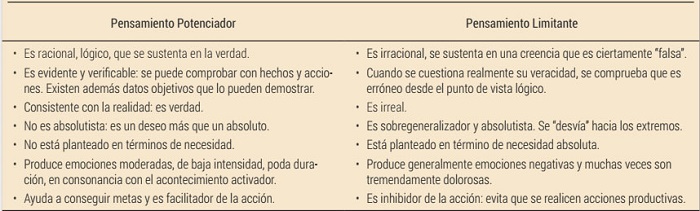 Las diferencias entre pensamiento potenciador y pensamiento limitante se observan de manera esquemática en la Tabla 1.