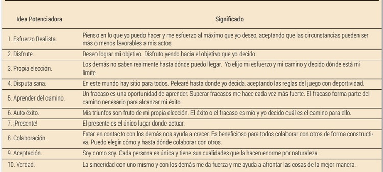 A continuación, presentamos una propuesta de diez pensamientos potenciadores, que cumplen las características antes citadas y que, “implantados” en el esquema cognitivo de los deportistas, favorecerán en buena medida su funcionamiento.