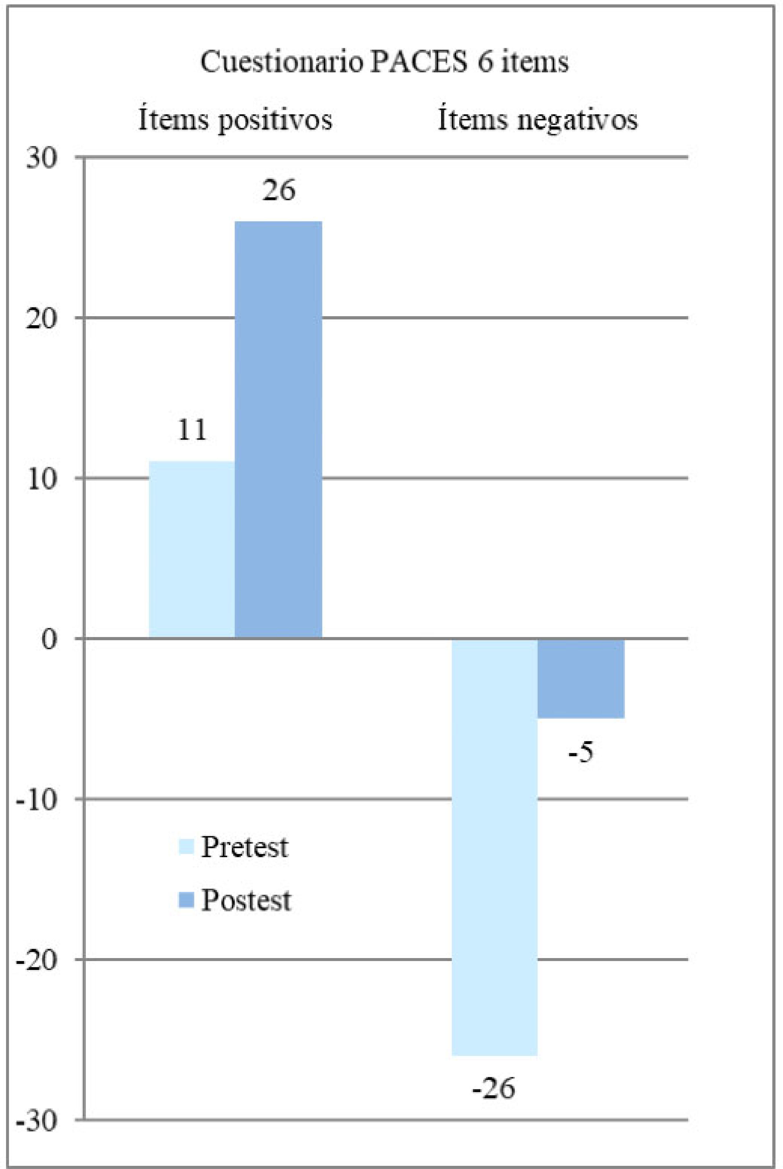 En la Figura 1 se puede observar las puntuaciones agrupadas en ítems positivos e ítems negativos. Se consideran en este trabajo positivos los ítems que aportan información sobre el disfrute, asimismo, se han agrupado por su contenido en formato bipolar, los ítems negativos serían sus contrarios (“me gusta vs. no me gusta”). Podemos observar que las puntuaciones han tenido un aumento significativo en el disfrute en general. Las puntuaciones relacionadas con el no disfrute pasan de -26 a -5.