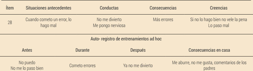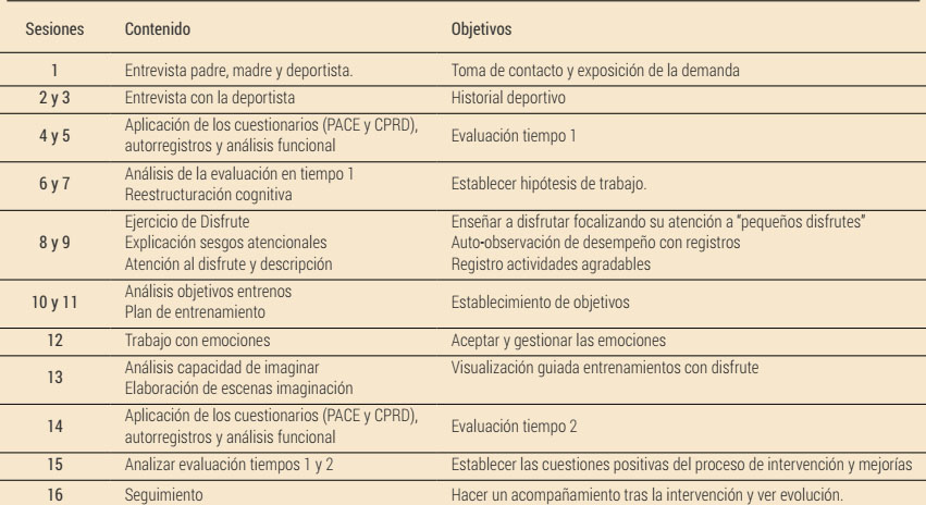 Por medio de la reestructuración cognitiva (García y Rajo, 2020) se establecen comparaciones entre las creencias irracionales y desadaptadas y otras más adaptadas con el objetivo de que se produzca un cambio cognitivo en la manera de pensar. Los autorregistros se utilizan en la Psicología para tomar conciencia de un comportamiento concreto y observar la realidad objetiva (Weinberg y Gould, 2010). Esta herramienta ha sido muy útil ya que aporta información de primera mano de la deportista y fueron cumplimentados en el club de entrenamiento. En el uso de la visualización guiada o imaginería, se ha tenido en cuenta que esta herramienta tiene efectos positivos en el aprendizaje de la técnica y táctica deportiva como puede ser el control cognitivo y emocional, la focalización atencional, así como el establecimiento de metas (Cox, 2009). Por otra parte, el plan de entrenamiento se adapta a una consecución de metas orientadas a fomentar el disfrute de la deportista, como “declaraciones de intencionalidad” como por ejemplo “quiero pasármelo bien” (Weinberg y Gould, 2010).