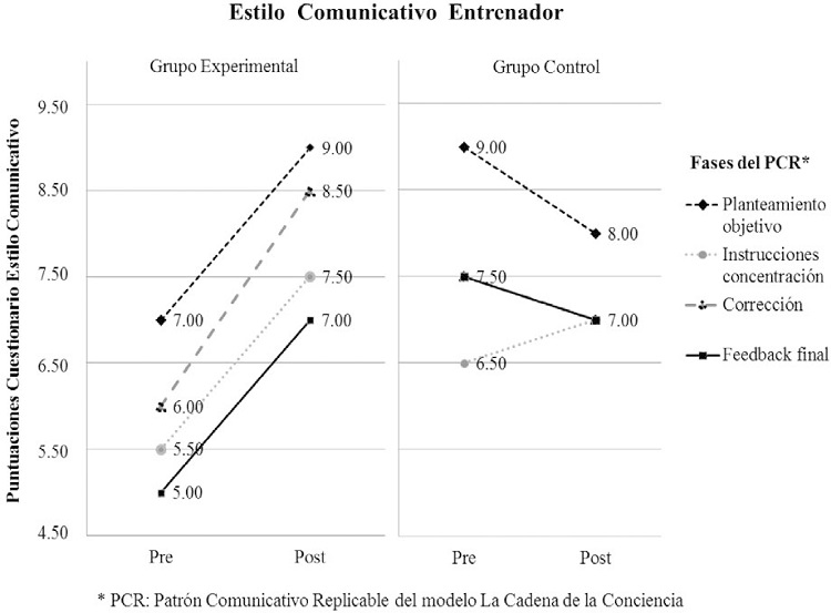 Las puntuaciones del Cuestionario sobre el Estilo Comunicativo del Entrenador recogidas por los propios entrenadores (Figura 1), muestran cambios pre-pos percibidos positivos y más visibles en el entrenador del GE. El entrenador del GC reporta puntuaciones menores en las medidas pos-intervención para todas las fases comunicativas, excepto en la Fase 2, correspondiente a dar las instrucciones.