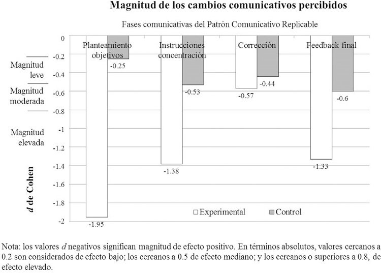 La magnitud de efecto, calculada con la d de Cohen, se muestra en la Figura 2. Los cambios percibidos en el GE son de mayor magnitud en todos los casos, especialmente elevada (> .08 en valores absolutos) para las fases de Planteamiento objetivos (-1.95), Instrucciones para la concentración (-1.38) y Feedback final (-1.33).